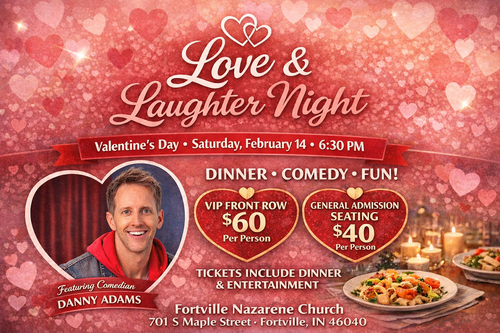 Love & Laughter Night is a Valentine’s Day dinner and comedy event for couples and groups of friends. Join us for an evening filled with great food, clean comedy, and lots of laughter featuring comedian Danny Adams.